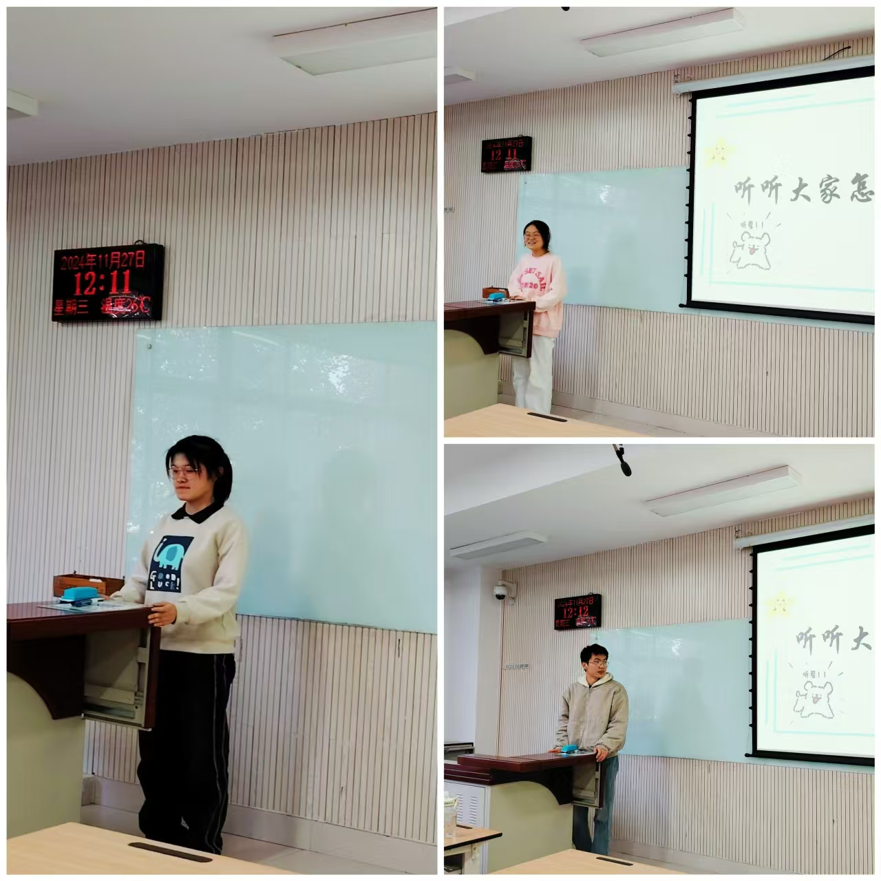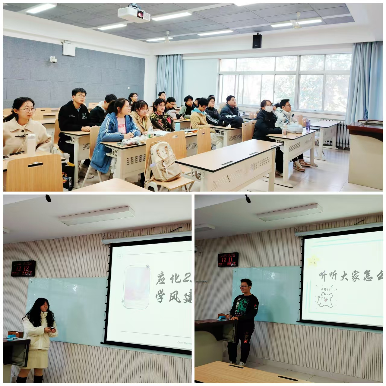 追寻榜样,踔厉奋发。获得国家奖学金的周江川同学分享了其学习方法和生活习惯,并对同学们的问题进行相应解答。获得国家励志奖学金的张梦雪和朱燕婷同学,分别分享了他们的学习经验和方法,并激励同学们在学习上应具备踏实、勤奋、善思的品质。周江川同学表示,“努力是一种长期坚持”,并生动地讲述了他在获得国家奖学金过程中的经历与感悟。此外,学风监督员穆泽麟同学对班级开学以来的学习问题进行了总结并提出解决方法,引发了同学们对自我学习的深刻反思。