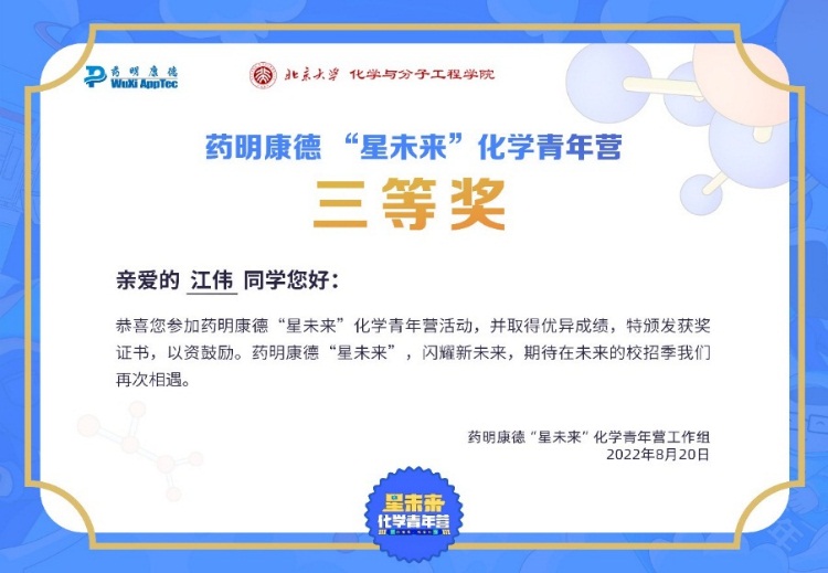 近日,公司谢卫青教授课题组2021级博士研究生江伟同学在药明康德举办的第五届“星未来”化学青年营活动中荣获三等奖。