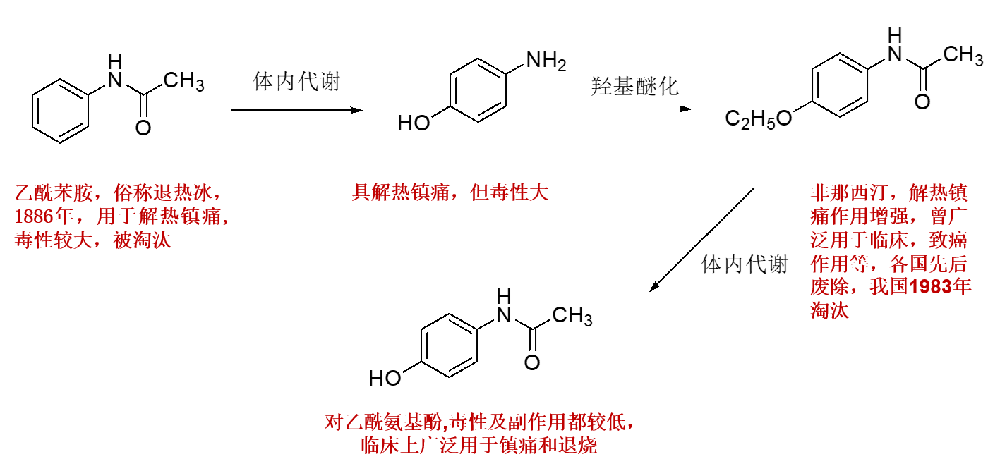 通过讲述不同时期苯胺类药物演变的故事,引出了目前唯一广泛应用于发热、头痛、神经痛、风湿痛和痛经的“苯胺类解热镇痛药”:对乙酰氨基酚。同时还回顾了第二章新药研究的基本原理和方法中的重点内容:先导化合物的发现途径(以现有药物的代谢研究发现先导化合物)。