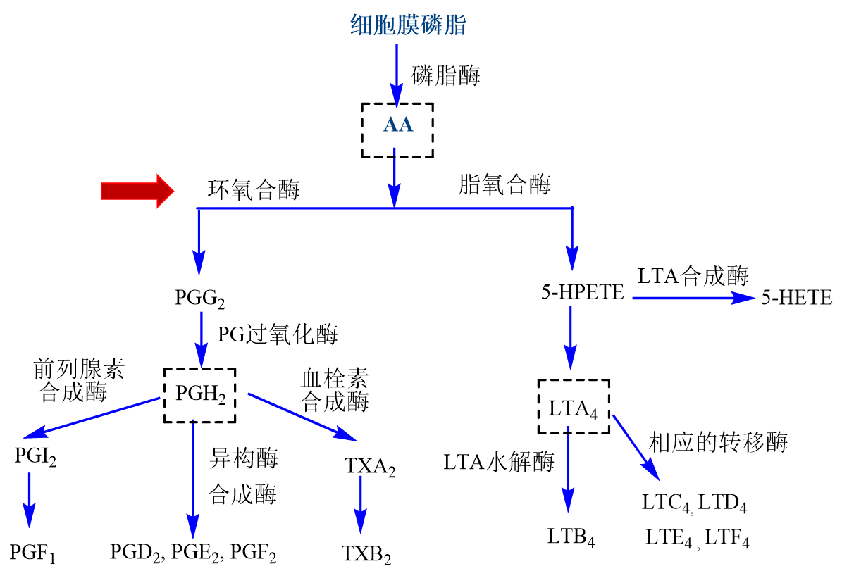 从炎症反应、炎症介质及与介质生成相关的酶出发,讲述炎症的发生机制和多数解热镇痛药解热、镇痛、抗炎的共同作用机制:抑制花生四烯酸(AA)代谢过程中的环氧合酶(COX),使前列腺素(PGs)合成减少,回答问题2。