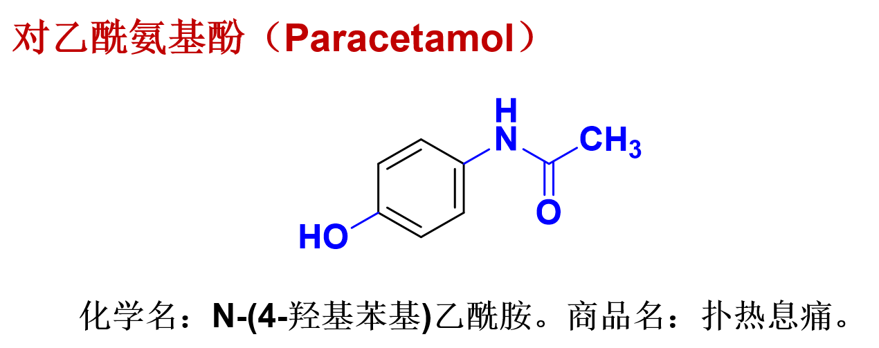 (2)对乙酰氨基酚的化学名、结构、理化性质(弱酸性)、临床用途(多种抗感冒复方制剂的活性成分,严重肝肾功能不全者禁用)、体内代谢、毒性及化学合成。