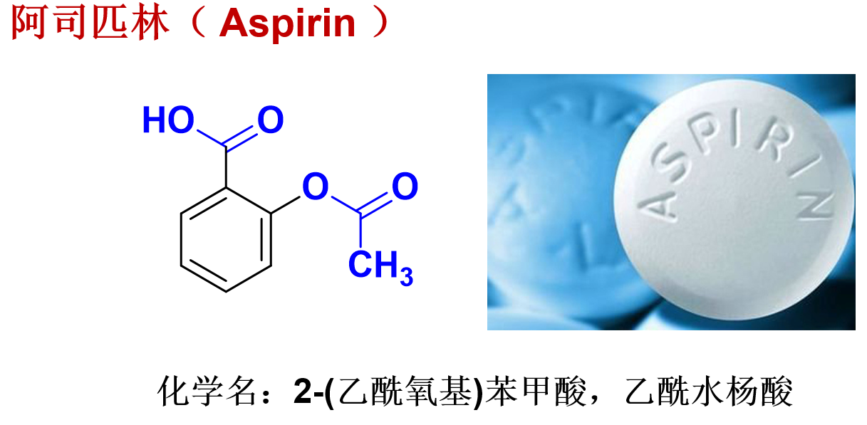 (2)阿司匹林的化学名、结构、理化性质(不稳定性:酯基,受潮或碱性溶液可水解;水解后的水杨酸易氧化)、药理作用及临床应用(不可逆COX抑制剂,具有强效的抗血小板聚集作用,可用于心血管系统疾病的预防和治疗,抗血栓)、不良反应(胃肠道刺激)、体内代谢及合成。
