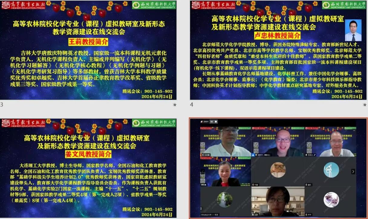 为深入贯彻2024年全国教育工作会议精神,推动教育数字化战略行动及高等公司高质量教材体系建设,高等农林院校化学专业(课程)虚拟教研室及新形态教学资源建设在线交流会于2024年6月24日召开。本次专题研讨会由高等教育出版社郭新华编审和公司王俊儒教授共同主持,来自全国20余所高校的经理、虚拟教研室负责人、一线教师等近百人参会。公司经理王进义教授致辞。他指出,去年年初至今连续举办的十余场次全国性系列课程研讨会对于推动新时期高等农林院校化学专业(课程)建设具有重要意义。